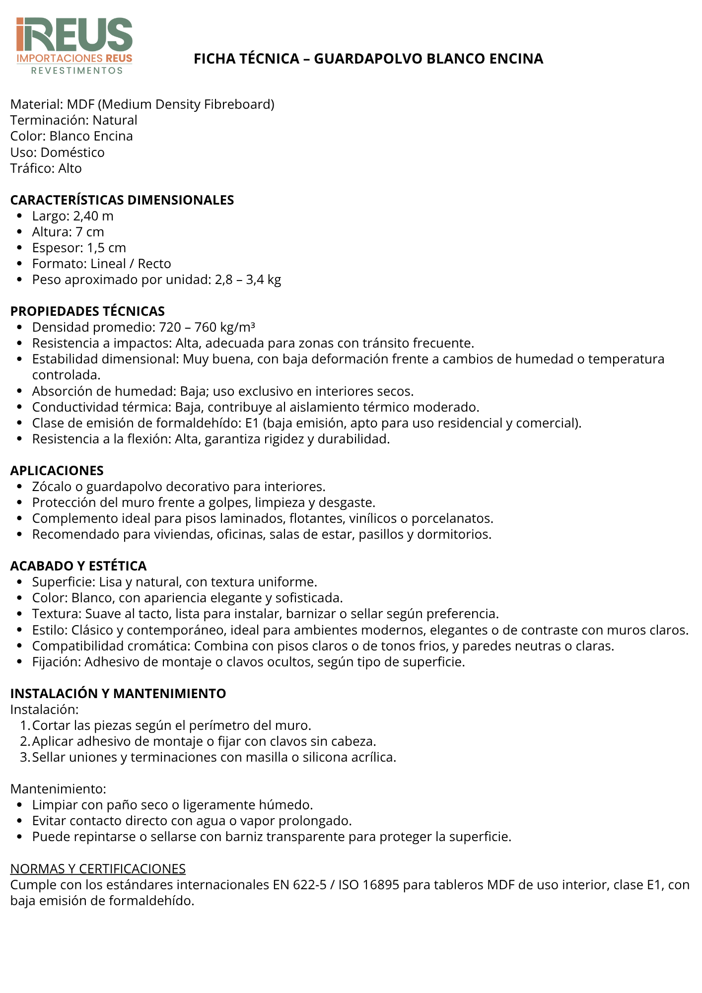 Guardapolvo Blanco Encina 15x70x240mm Stock por sucursal Stock por sucursal $ 2.990 cantidad Agregar al carro Encargar