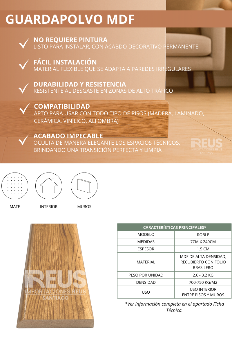 Guardapolvo Roble 15x70x240mm Stock por sucursal Stock por sucursal $ 2.990 cantidad Agregar al carro Encargar Imágenes referenciales: los colores pueden variar según la configuración de cada pantalla.
