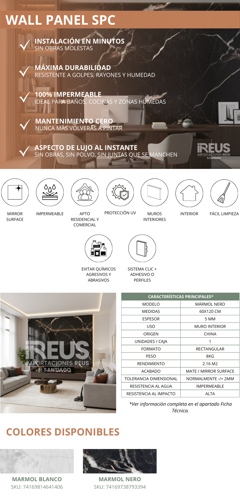 Wall Panel SPC Interior 60x120cmx5mm $10.825xm² - MARMOL NERO
